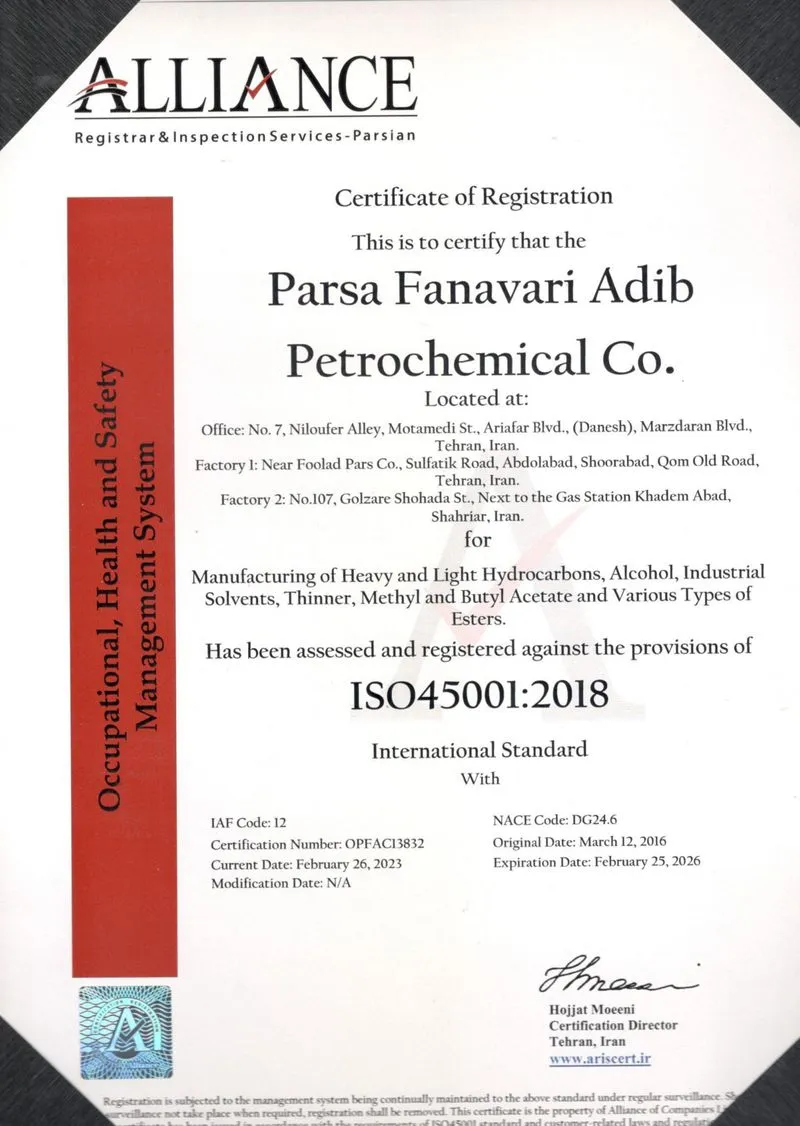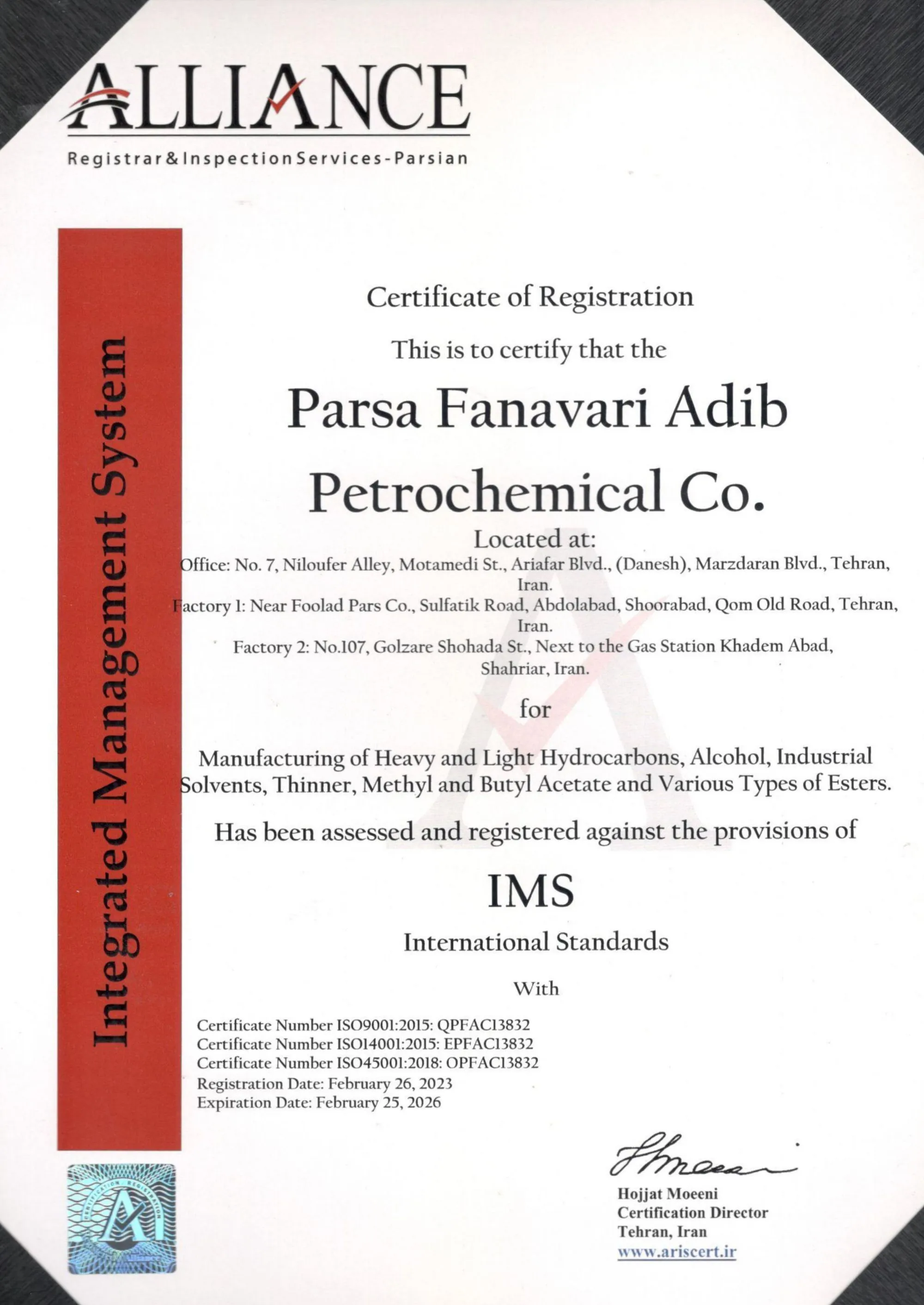 شرکتپتروشیمی پارسا فنآوری ادیب با برخورداری از انواع گواهینامههای معتبر بینالمللی، تعهد خود را به کیفیت، ایمنی و استانداردهای جهانی به اثبات رسانده است. این شرکت مفتخر به دریافت گواهینامههای ISO 9001، ISO 14001، ISO 45001، گواهینامه آزمایشگاهی ISO 17025، استاندارد تخصصی TS 29001 و همچنین گواهینامه CE میباشد که نشاندهنده پایبندی آن به اصول مدیریتی، زیستمحیطی، ایمنی و کیفیت در سطح بینالمللی است.